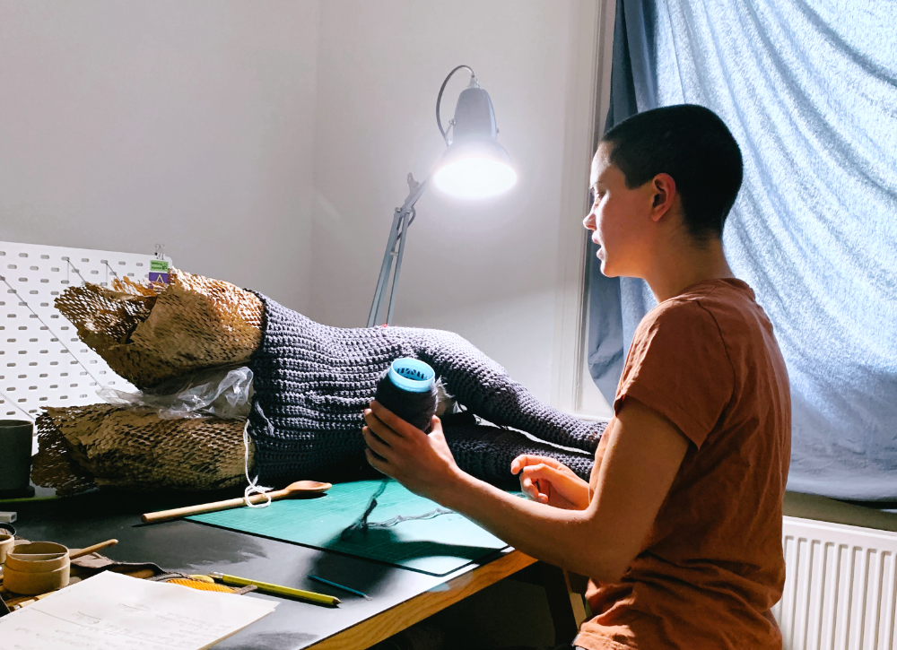 Ich recycle Textilien und benutze Fasern aus anderen Kontexten oder vertraue auf erneuerbaren Rohstoffen.