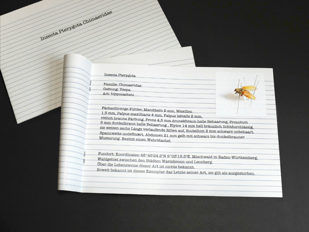 Das Projekt “Insecta Pterygota Chimaeridae” beschäftigt sich mit dem Aussterben von unentdeckten Arten auf unserem Planeten. Es besteht aus zwei Teilen. Miniaturskulpturen und einem dazugehörigen Buch.